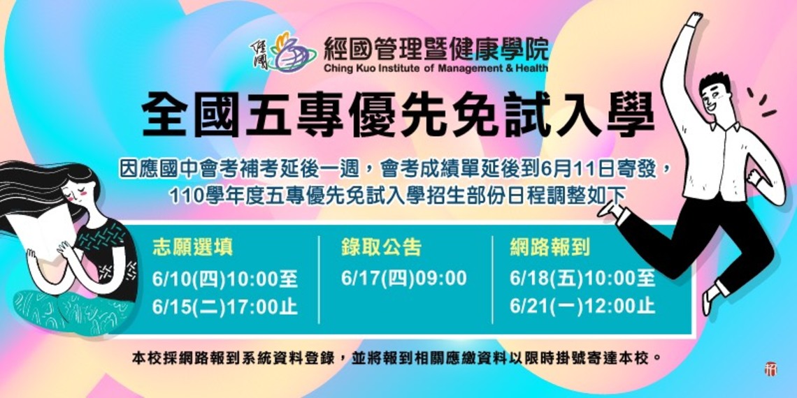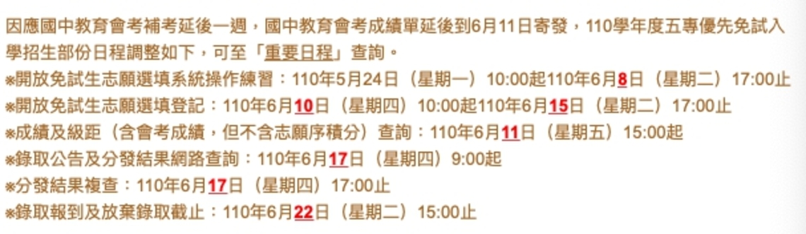 因應國中教育會考補考延後一週,國中教育會考成績單延後到6月11日寄發,110學年度五專優先免試入學招生部份日程調整如下,可至「重要日程」查詢。